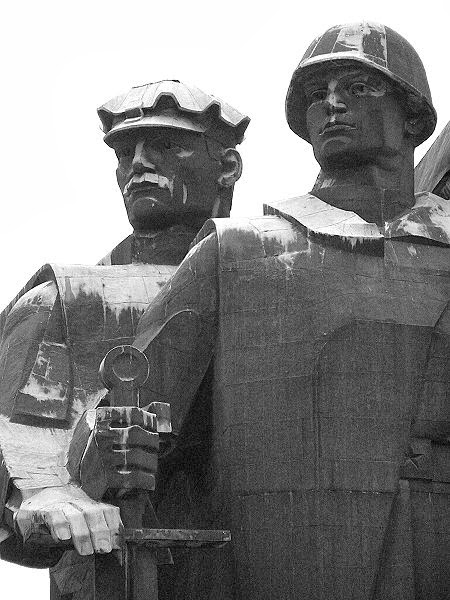 vers le bas. La main gauche du soldat est soulevée, la main gauche du mineur est prise de côté. Le soldat est un jeune homme au visage pointu, et le mineur est un homme mûr. Les portraits ont été sculptées sans modèle. Les